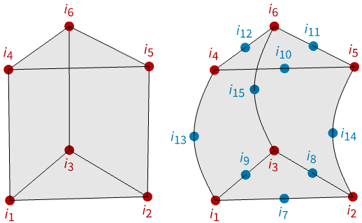 - For quadratic prism elements, the next nine incidents are mid-side nodes of possibly curved edges.