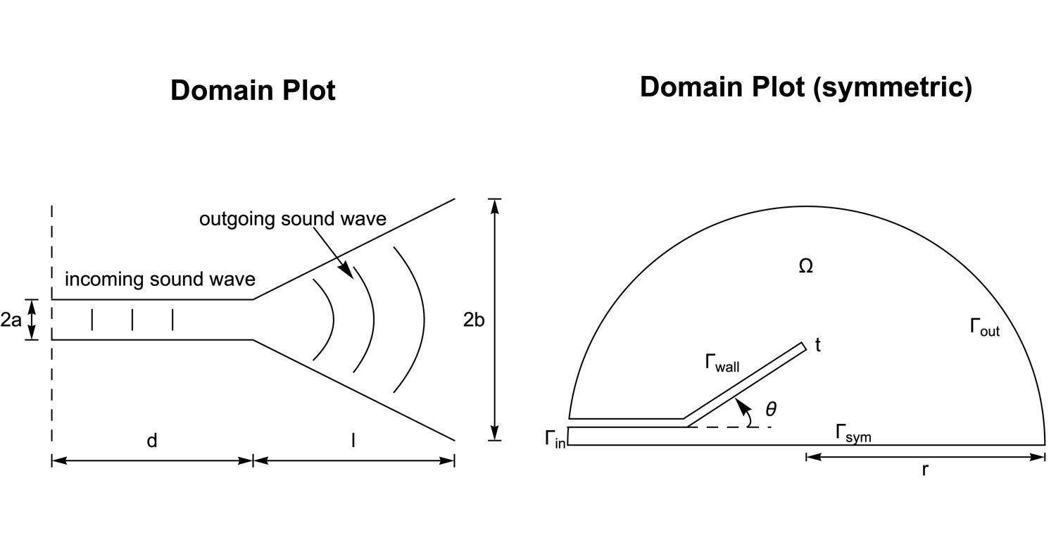 The acoustic horn geometric model consists of two parts: a semi-infinite sound channel with width