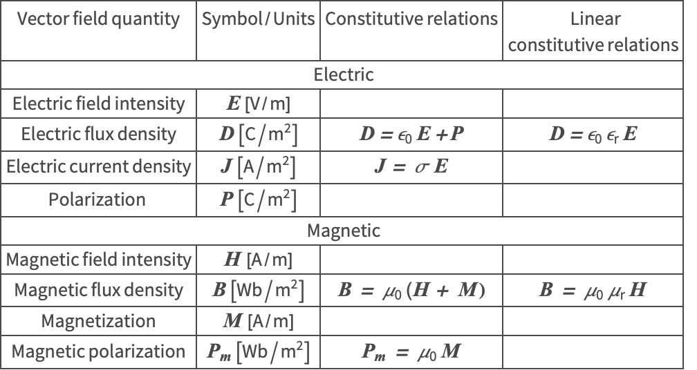 The following table summarizes the main quantities and the constitutive relations used for describing EM fields.