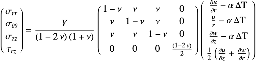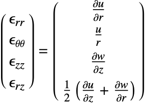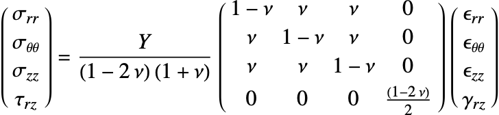 The axisymmetric case additionally requires that the equilibrium equations be adapted to the cylindrical coordinate system. More information on the axisymmetric solid mechanics approximation is given in the Axisymmetric Solid Mechanics section.