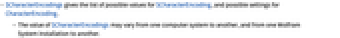 - $CharacterEncodings gives the list of possible values for $CharacterEncoding, and possible settings for CharacterEncoding.