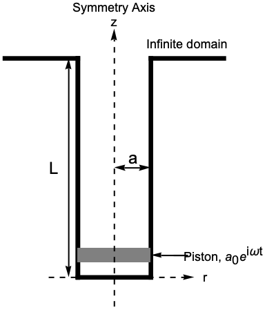 The following acoustic model describes an open pipe, wherein a vibrating piston is placed inside one end of the pipe while the other end of the pipe opens into an infinite domain. In this case, an impedance boundary condition is placed on one end to model the infinite domain. The pipe that will be modeled is a flanged circular pipe, as shown in the following figure below: