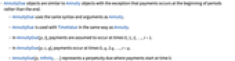 - AnnuityDue uses the same syntax and arguments as Annuity.
