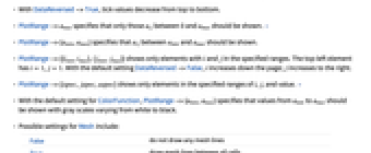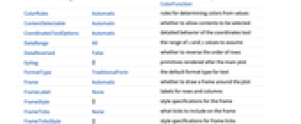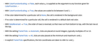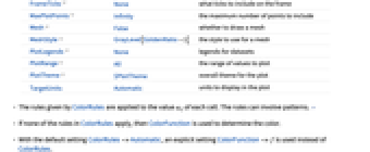 values to assume DataReversed False whether to reverse the order of rows Frame Automatic whether to draw a frame around the plot FrameLabel None labels for rows and columns FrameTicks None what ticks to include on the frame MaxPlotPoints Infinity the maximum number of points to include Mesh False whether to draw a mesh MeshStyle GrayLevel[GoldenRatio-1] the style to use for a mesh PlotLegends None legends for datasets PlotRange All the range of values to plot PlotTheme $PlotTheme overall theme for the plot TargetUnits Automatic units to display in the plot - ColorRules can take the following settings: