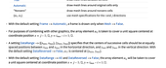 False do not draw any mesh lines True draw mesh lines between all cells Automatic draw mesh lines around original cells only "Nonzero" draw mesh lines around nonzero cells {mi,mj} use mesh specifications for the i and j directions - With the default setting Frame->Automatic, a frame is drawn only when Mesh->False.
