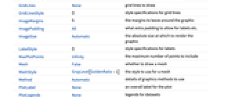 values to assume DataReversed False whether to reverse the order of rows Epilog {} primitives rendered after the main plot FormatType TraditionalForm the default format type for text Frame Automatic whether to draw a frame around the plot FrameLabel None labels for rows and columns FrameStyle {} style specifications for the frame FrameTicks None what ticks to include on the frame FrameTicksStyle {} style specifications for frame ticks GridLines None grid lines to draw GridLinesStyle {} style specifications for grid lines ImageMargins 0. the margins to leave around the graphic ImagePadding All what extra padding to allow for labels etc. ImageSize Automatic the absolute size at which to render the graphic LabelStyle {} style specifications for labels MaxPlotPoints Infinity the maximum number of points to include Mesh False whether to draw a mesh MeshStyle GrayLevel[GoldenRatio-1] the style to use for a mesh Method Automatic details of graphics methods to use PlotLabel None an overall label for the plot PlotLegends None legends for datasets PlotRange All the range of values to plot PlotRangeClipping False whether to clip at the plot range PlotRangePadding Automatic how much to pad the range of values PlotRegion Automatic the final display region to be filled PlotTheme $PlotTheme overall theme for the plot PreserveImageOptions Automatic whether to preserve image options when displaying new versions of the same graphic Prolog {} primitives rendered before the main plot RotateLabel True whether to rotate y labels on the frame TargetUnits Automatic units to display in the plot Ticks Automatic axes ticks TicksStyle {} style specifications for axes ticks