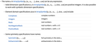 - Valid dimension specifications ni in ArraySymbol[a,{n1,n2,…},dom, sym] are positive integers. It is also possible to work with symbolic dimension specifications.