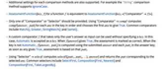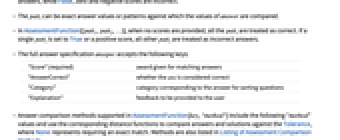 "ComparisonMethod" named comparison method "method" "Comparator" custom function to compare provided answer to each pattern in key "Selector" function to select matching pattern for provided answer "ListAssessment" specify the method for assessing listed answers "ExplanationFunction" function for generating feedback to the user "ScoringFunction" function for generating a custom score "ScoreCombiner" function to combine elementwise "Score" values "AnswerCorrectCombiner" function to combine elementwise "AnswerCorrect" values - Additional settings for each comparison methods are also supported. For example the "String" comparison method supports IgnoreCase.