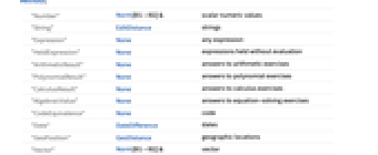 "Number" Norm[#1-#2]& scalar numeric values "String" EditDistance strings "Expression" None any expression "HeldExpression" None expressions held without evaluation "ArithmeticResult" None answers to arithmetic exercises "PolynomialResult" None answers to polynomial exercises "CalculusResult" None answers to calculus exercises "AlgebraicValue" None answers to equation-solving exercises "CodeEquivalence" None code "Date" DateDifference dates "GeoPosition" GeoDistance geographic locations "Vector" Norm[#1-#2]& vector "Color" ColorDistance color values "Quantity" Norm[#1-#2]& quantity with magnitude and unit - In AssessmentFunction[key,comp], comp is an Association. The accepted keys are: