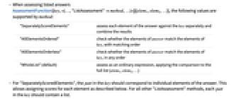 - When assessing listed answers AssessmentFunction[key,<|…,"ListAssessment"method,…|>][{elem1,elem2,…}], the following values are supported by method: