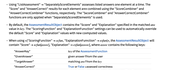 - When using <|"ScoringFunction"scfun,"ExplanationFunction"exfun|>, the AssessmentResultObject will contain "Score"scfun[assoc], "Explanation"exfun[assoc], where assoc contains the following keys: