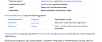 DistanceFunction Automatic distance metric to use Tolerance Automatic distance to accept when matching answers MaxItems Infinity limit on number of elements in elementwise assessment - AssessmentFunction[key] is equivalent to AssessmentFunction[key,Automatic] and infers an answer comparison type from key.