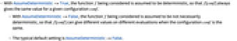 - With AssumeDeterministic->False, the function f being considered is assumed to be not necessarily deterministic, so that f[conf] can give different values on different evaluations when the configuration conf is the same.