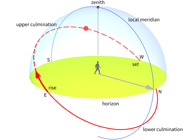 "Rise" the body astro crosses the horizon upward, in the east "Set" the body astro crosses the horizon downward, in the west "UpperCulmination" the body astro crosses the local meridian at its highest altitude "LowerCulmination" the body astro crosses the local meridian at its lowest altitude - AstroRiseSet[astro,{etype1,etype2,…},…] returns a list of pairs dateetypei of the next events of the given types, sorted by dates.