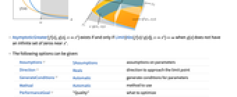 Assumptions $Assumptions assumptions on parameters Direction Reals direction to approach the limit point GenerateConditions Automatic generate conditions for parameters Method Automatic method to use PerformanceGoal "Quality" what to optimize - Possible settings for Direction include: