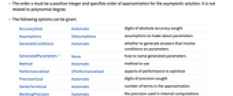AccuracyGoal Automatic digits of absolute accuracy sought Assumptions $Assumptions assumptions to make about parameters GenerateConditions Automatic whether to generate answers that involve conditions on parameters GeneratedParameters None how to name generated parameters Method Automatic method to use PerformanceGoal $PerformanceGoal aspects of performance to optimize PrecisionGoal Automatic digits of precision sought SeriesTermGoal Automatic number of terms in the approximation WorkingPrecision Automatic the precision used in internal computations - Possible settings for PerformanceGoal include $PerformanceGoal, "Quality" and "Speed". With the "Quality" setting, AsymptoticIntegrate typically solves more problems or produces simpler results, but it potentially uses more time and memory.