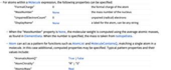 "AromaticAtomQ" True|False "AtomChirality" "R"|"S" "AtomicMass" Real "AtomicNumber" Integer "CIPRank" Integer "CoordinationNumber" Integer "FormalCharge" Integer "GasteigerPartialCharge" Real "GeometricStericEffectIndex" Real "HeavyAtomCoordinationNumber" Integer "HydrogenCount" Integer "ImplicitHydrogenCount" Integer "MassNumber" Integer "MMFFPartialCharge" Real "OrbitalHybridization" "SP"|"SP3"… "OuterShellElectronCount" Integer "PiElectronCount" Integer "RingAtomQ" True|False "TopologicalStericEffectIndex" Real "UnpairedElectronCount" Integer "UnsaturatedAtomQ" True|False "Valence" Integer - Numeric properties may also be specified using GreaterThan, LessThan, GreaterEqualThan, LessEqualThan or Between.