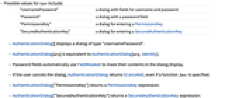 "UsernamePassword" a dialog with fields for username and password "Password" a dialog with a password field "PermissionsKey" a dialog for entering a PermissionsKey "SecuredAuthenticationKey" a dialog for entering a SecuredAuthenticationKey - AuthenticationDialog[] displays a dialog of type "UsernamePassword".