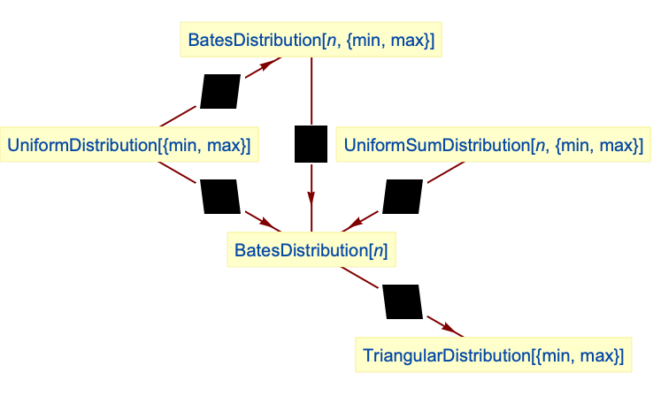 - BatesDistribution is closely related to a number of other distributions. For example, the PDF of a Bates distribution is precisely UniformDistribution and TriangularDistribution for