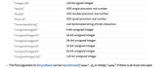 "Byte" 8‐bit unsigned integer "Character8" 8‐bit character "Character16" 16‐bit character "Character32" 32-bit character "Complex64" IEEE single‐precision complex number "Complex128" IEEE double‐precision complex number "Complex256" IEEE quad‐precision complex number "Integer8" 8‐bit signed integer "Integer16" 16‐bit signed integer "Integer24" 24-bit signed integer "Integer32" 32‐bit signed integer "Integer64" 64‐bit signed integer "Integer128" 128‐bit signed integer "Real32" IEEE single‐precision real number "Real64" IEEE double‐precision real number "Real128" IEEE quad‐precision real number "TerminatedString" null‐terminated string of 8‐bit characters "UnsignedInteger8" 8‐bit unsigned integer "UnsignedInteger16" 16‐bit unsigned integer "UnsignedInteger24" 24-bit unsigned integer "UnsignedInteger32" 32‐bit unsigned integer "UnsignedInteger64" 64‐bit unsigned integer "UnsignedInteger128" 128‐bit unsigned integer - The first argument to BinaryRead can be InputStream["name",n], or simply "name" if there is at most one open input stream with the specified name. BinaryRead will call OpenRead to open files with no associated stream.