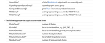 "Name" biomolecule name "BioSequence" a BioSequence with type "HybridStrand" "ModelCount" number of models (usually one) "Models" a list of BioMolecule objects with one model each "AssemblyCount" number of assemblies "AssemblyData" data for assemblies "Assemblies" a list of BioMolecule objects with one assembly each "CrystallographicSpaceGroup" crystallographic space group "ComputedStructureQ" gives True if biomol is a predicted structure "PDBString" a string representing biomol in the "PDB" format "MMCIFString" a string representing biomol in the "MMCIF" format - The following properties apply at the model level: