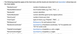 "ChainCount" number of chains "ChainIDs" list of chain identifiers, e.g. {"A","B",…} "AuthorChainIDs" list of chain identifiers given by the original author "PolymerChainCount" number of polymer chains "PolymerChainLabels" list of labels for polymer chains "ResidueCount" number of residues in all chains - The following properties apply at the chain level, and the results are returned in an Association whose keys are the chain labels: