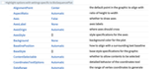 AlignmentPoint Center the default point in the graphic to align with AspectRatio Automatic ratio of height to width Axes False whether to draw axes AxesLabel None axes labels AxesOrigin Automatic where axes should cross AxesStyle {} style specifications for the axes Background None background color for the plot BaselinePosition Automatic how to align with a surrounding text baseline BaseStyle {} base style specifications for the graphic ContentSelectable Automatic whether to allow contents to be selected CoordinatesToolOptions Automatic detailed behavior of the coordinates tool DataRange Automatic the range of vertex coordinates to generate DirectedEdges False whether to interpret Rule as DirectedEdge EdgeLabels None labels and label placements for edges EdgeLabelStyle Automatic style to use for edge labels EdgeShapeFunction Automatic generate graphic shapes for edges EdgeStyle Automatic styles for edges Epilog {} primitives rendered after the main plot FormatType TraditionalForm the default format type for text Frame False whether to put a frame around the plot FrameLabel None frame labels FrameStyle {} style specifications for the frame FrameTicks Automatic frame ticks FrameTicksStyle {} style specifications for frame ticks GraphHighlight {} vertices and edges to highlight GraphHighlightStyle Automatic style for highlight GraphLayout Automatic how to lay out vertices and edges GridLines None grid lines to draw GridLinesStyle {} style specifications for grid lines ImageMargins 0. the margins to leave around the graphic ImagePadding All what extra padding to allow for labels etc. ImageSize Automatic the absolute size at which to render the graphic LabelStyle {} style specifications for labels Method Automatic method to use PerformanceGoal Automatic aspects of performance to try to optimize PlotLabel None an overall label for the plot PlotRange All range of values to include PlotRangeClipping False whether to clip at the plot range PlotRangePadding Automatic how much to pad the range of values PlotRegion Automatic the final display region to be filled PlotStyle Automatic graphics directives to determine styles PlotTheme Automatic overall theme for the graph PreserveImageOptions Automatic whether to preserve image options when displaying new versions of the same graphic Prolog {} primitives rendered before the main plot RotateLabel True whether to rotate y labels on the frame Ticks Automatic axes ticks TicksStyle {} style specifications for axes ticks VertexCoordinates Automatic coordinates for vertices VertexLabels None labels and label placements for vertices VertexLabelStyle Automatic style to use for vertex labels VertexShape Automatic graphic shape for vertices VertexShapeFunction Automatic generate graphic shapes for vertices VertexSize Automatic size of vertices VertexStyle Automatic styles for vertices