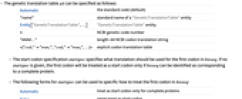 Automatic the standard code (default) "name" standard name of a "GeneticTranslationTable" entity Entity["GeneticTranslationTable",…] "GeneticTranslationTable" entity n NCBI genetic code number "AAAA…" length-64 NCBI codon translation string <|"cod1""tran1","cod2""tran2",…|> explicit codon translation table - The start codon specification startspec specifies what translation should be used for the first codon in bioseq. If no startspec is given, the first codon will be treated as a start codon only if bioseq can be identified as corresponding to a complete protein.