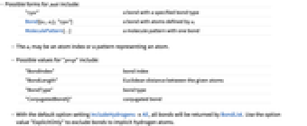 "type" a bond with a specified bond type Bond[{a1,a2},"type"] a bond with atoms defined by ai MoleculePattern[…] a molecule pattern with one bond - The ai may be an atom index or a pattern representing an atom.