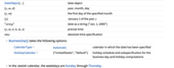 DateObject[…] date object {y,m,d} year, month, day {y,m} the first day of the specified month {y} January 1 of the year y "string" date as a string ("Jan. 1, 2000") {y,m,d,h,m,s} precise time time absolute time specification - BusinessDayQ takes the following options: