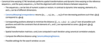 - Canonical time warping (CTW) iteratively performs spatial transformations and dynamic time warping on the reference sequence s1 and the query sequence s2 to find the alignment with minimal distance between sequences.