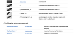 DistanceFunction Automatic distance function used in dynamic time warping MaxIterations Automatic maximal number of iterations Method Automatic additional parameters - The following options are available through Method->opts: