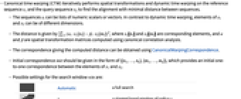 - Canonical time warping (CTW) iteratively performs spatial transformations and dynamic time warping on the reference sequence s1 and the query sequence s2 to find the alignment with minimal distance between sequences.