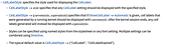 - CellLabelStyle->style specifies that any CellLabel setting should be displayed with the specified style.