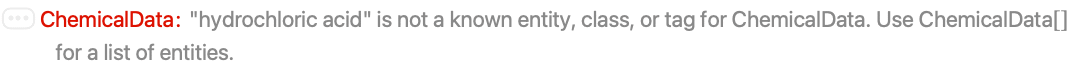 "Description" short textual description of the property "Interval" uncertainty range given by Interval[…] "LongDescription" longer textual description of the property "Note" additional information about the property "Units" units in which the value is given "Conditions" conditions under which the property was measured "UnitsName" English name for the units used "UnitsNotation" notation for the units used "UnitsStandardName" Wolfram Language standard name for the units used "Value" property value (default if no annotation is specified) - ChemicalData[{"name","Compound"}] gives a list of available chemicals that contain the element with the specified name.