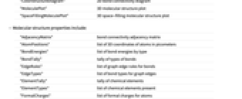 "AdjacencyMatrix" bond connectivity adjacency matrix "AtomPositions" list of 3D coordinates of atoms in picometers "BondEnergies" list of bond energies by type "BondTally" tally of types of bonds "EdgeRules" list of graph edge rules for bonds "EdgeTypes" list of bond types for graph edges "ElementTally" tally of chemical elements "ElementTypes" list of chemical elements present "FormalCharges" list of formal charges for atoms "InChI" InChI structure string "IsomericSMILES" isomeric SMILES structure string "NetCharge" net charge "NonStandardIsotopeNumbers" list of non-standard isotope mass numbers present "NonStandardIsotopeTally" tally of non-standard isotopes present "SMILES" canonical SMILES structure string "StructureGraph" bond connectivity graph "VertexCoordinates" list of 2D relative coordinates of graph vertices "VertexTypes" list of atom types at graph vertices - Properties calculated from structure include:
