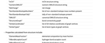 "ElementMassFraction" elemental composition by mass fraction "HBondAcceptorCount" hydrogen bond acceptor count "HBondDonorCount" hydrogen bond donor count "NonHydrogenCount" non-hydrogen atom count "NonStandardIsotopeCount" number of non-standard-isotope atoms "PartitionCoefficient" partition coefficient for octanol/water solubility "RotatableBondCount" rotatable bond count "TautomerCount" tautomer count "TopologicalPolarSurfaceArea" topological polar surface area - Ionic properties include: