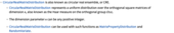 - CircularRealMatrixDistribution is also known as circular real ensemble, or CRE.