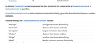 ClusterDissimilarityFunction Automatic the clustering linkage algorithm to use DistanceFunction Automatic the distance or dissimilarity to use EdgeStyle GrayLevel[0.65] styles for edges FeatureExtractor Automatic how to extract features from data VertexSize 0 size of vertices - By default, ClusteringTree will preprocess the data automatically unless either a DistanceFunction or a FeatureExtractor is specified.