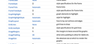 AlignmentPoint Center the default point in the graphic to align with AnnotationRules {} annotations for graph, edges and vertices AspectRatio Automatic ratio of height to width Axes False whether to draw axes AxesLabel None axes labels AxesOrigin Automatic where axes should cross AxesStyle {} style specifications for the axes Background None background color for the plot BaselinePosition Automatic how to align with a surrounding text baseline BaseStyle {} base style specifications for the graphic ClusterDissimilarityFunction Automatic the clustering linkage algorithm to use ContentSelectable Automatic whether to allow contents to be selected CoordinatesToolOptions Automatic detailed behavior of the coordinates tool DirectedEdges Automatic whether to interpret Rule as DirectedEdge DistanceFunction Automatic the distance or dissimilarity to use EdgeLabels None labels and label placements for edges EdgeLabelStyle Automatic style to use for edge labels EdgeShapeFunction Automatic generate graphic shapes for edges EdgeStyle GrayLevel[0.65] styles for edges EdgeWeight Automatic weights for edges Epilog {} primitives rendered after the main plot FeatureExtractor Automatic how to extract features from data FormatType TraditionalForm the default format type for text Frame False whether to put a frame around the plot FrameLabel None frame labels FrameStyle {} style specifications for the frame FrameTicks Automatic frame ticks FrameTicksStyle {} style specifications for frame ticks GraphHighlight {} graph elements to highlight GraphHighlightStyle Automatic style for highlight GraphLayout Automatic how to lay out vertices and edges GridLines None grid lines to draw GridLinesStyle {} style specifications for grid lines ImageMargins 0. the margins to leave around the graphic ImagePadding All what extra padding to allow for labels etc. ImageSize Automatic the absolute size at which to render the graphic LabelStyle {} style specifications for labels Method Automatic details of graphics methods to use PerformanceGoal Automatic aspects of performance to try to optimize PlotLabel None an overall label for the plot PlotRange All range of values to include PlotRangeClipping False whether to clip at the plot range PlotRangePadding Automatic how much to pad the range of values PlotRegion Automatic the final display region to be filled PlotTheme $PlotTheme overall theme for the graph PreserveImageOptions Automatic whether to preserve image options when displaying new versions of the same graphic Prolog {} primitives rendered before the main plot RotateLabel True whether to rotate y labels on the frame Ticks Automatic axes ticks TicksStyle {} style specifications for axes ticks VertexCoordinates Automatic coordinates for vertices VertexLabels None labels and placements for vertices VertexLabelStyle Automatic style to use for vertex labels VertexShape Automatic graphic shape for vertices VertexShapeFunction Automatic generate graphic shapes for vertices VertexSize 0 size of vertices VertexStyle Automatic styles for vertices VertexWeight Automatic weights for vertices