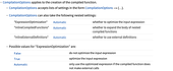 "ExpressionOptimization" Automatic whether to optimize the input expression "InlineCompiledFunctions" Automatic whether to expand the body of nested compiled functions "InlineExternalDefinitions" Automatic whether to use external definitions - Possible values for "ExpressionOptimization" are: