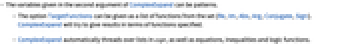 - ComplexExpand automatically threads over lists in expr, as well as equations, inequalities and logic functions.