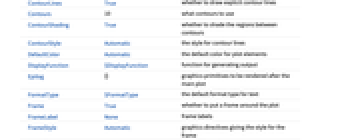 AspectRatio 1 ratio of height to width Axes False whether to draw axes AxesLabel None axes labels AxesOrigin Automatic where axes should cross AxesStyle Automatic graphics directives to specify the style for axes Background Automatic background color for the plot ColorFunction Automatic function specifying the color of regions between contour lines ColorFunctionScaling True whether to scale z values before applying a color function ColorOutput Automatic type of color output to produce ContourLines True whether to draw explicit contour lines Contours 10 what contours to use ContourShading True whether to shade the regions between contours ContourStyle Automatic the style for contour lines DefaultColor Automatic the default color for plot elements DisplayFunction $DisplayFunction function for generating output Epilog {} graphics primitives to be rendered after the main plot FormatType $FormatType the default format type for text Frame True whether to put a frame around the plot FrameLabel None frame labels FrameStyle Automatic graphics directives giving the style for the frame FrameTicks Automatic frame tick marks ImageSize Automatic the absolute size at which to render the graphic in a notebook MeshRange Automatic ranges of x and y coordinates PlotLabel None a label for the plot PlotRange Automatic range of z values to include PlotRegion Automatic the final display region to be filled Prolog {} graphics primitives to be rendered before the main plot RotateLabel True whether to rotate y labels on the frame TextStyle $TextStyle the default style for text Ticks Automatic tick marks - ContourGraphics[g] converts DensityGraphics and SurfaceGraphics objects to ContourGraphics. The resulting graphics can be rendered using Show.