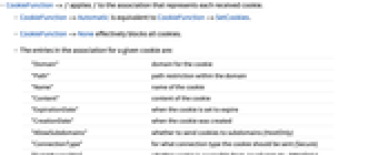 "Domain" domain for the cookie "Path" path restriction within the domain "Name" name of the cookie "Content" content of the cookie "ExpirationDate" when the cookie is set to expire "CreationDate" when the cookie was created "AllowSubdomains" whether to send cookies to subdomains (HostOnly) "ConnectionType" for what connection type the cookie should be sent (Secure) "ScriptAccessible" whether cookie is accessible from JavaScript etc. (HttpOnly) - CookieFunction is effectively applied to the "Cookies" entry in an HTTPResponse object.