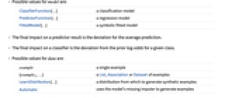 ClassifierFunction[…] a classification model PredictorFunction[…] a regression model FittedModel[…] a symbolic fitted model - The final impact on a predictor result is the deviation for the average prediction.