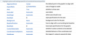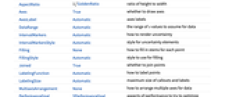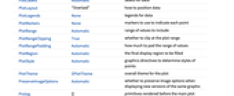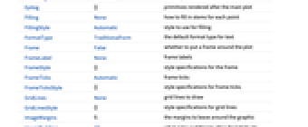 AlignmentPoint Center the default point in the graphic to align with AspectRatio 1/GoldenRatio ratio of height to width Axes True whether to draw axes AxesLabel Automatic axes labels AxesOrigin Automatic where axes should cross AxesStyle {} style specifications for the axes Background None background color for the plot BaselinePosition Automatic how to align with a surrounding text baseline BaseStyle {} base style specifications for the graphic ContentSelectable Automatic whether to allow contents to be selected CoordinatesToolOptions Automatic detailed behavior of the coordinates tool DataRange Automatic the range of x values to assume for data Epilog {} primitives rendered after the main plot Filling None how to fill in stems for each point FillingStyle Automatic style to use for filling FormatType TraditionalForm the default format type for text Frame False whether to put a frame around the plot FrameLabel None frame labels FrameStyle {} style specifications for the frame FrameTicks Automatic frame ticks FrameTicksStyle {} style specifications for frame ticks GridLines None grid lines to draw GridLinesStyle {} style specifications for grid lines ImageMargins 0. the margins to leave around the graphic ImagePadding All what extra padding to allow for labels etc. ImageSize Automatic the absolute size at which to render the graphic IntervalMarkers Automatic how to render uncertainty IntervalMarkersStyle Automatic style for uncertainty elements Joined True whether to join points LabelingFunction Automatic how to label points LabelingSize Automatic maximum size of callouts and labels LabelStyle {} style specifications for labels Method Automatic details of graphics methods to use MultiaxisArrangement None how to arrange multiple axes for data PerformanceGoal $PerformanceGoal aspects of performance to try to optimize PlotLabel Automatic overall label for the plot PlotLabels Automatic labels for data PlotLayout "Overlaid" how to position data PlotLegends None legends for data PlotMarkers None markers to use to indicate each point PlotRange Automatic range of values to include PlotRangeClipping True whether to clip at the plot range PlotRangePadding Automatic how much to pad the range of values PlotRegion Automatic the final display region to be filled PlotStyle Automatic graphics directives to determine styles of points PlotTheme $PlotTheme overall theme for the plot PreserveImageOptions Automatic whether to preserve image options when displaying new versions of the same graphic Prolog {} primitives rendered before the main plot RotateLabel True whether to rotate y labels on the frame ScalingFunctions Automatic how to scale individual coordinates TargetUnits Automatic units to display in the plot Ticks Automatic axes ticks TicksStyle {} style specifications for axes ticks