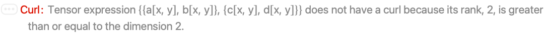 - In Curl[f,{x1,…,xn}], if f is an array with depth k<n, it must have dimensions {n,…,n}, and the resulting curl is an array with depth n-k-1 of dimensions {n,…,n}.