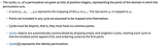 - The cycles cyci of a permutation are given as lists of positive integers, representing the points of the domain in which the permutation acts.