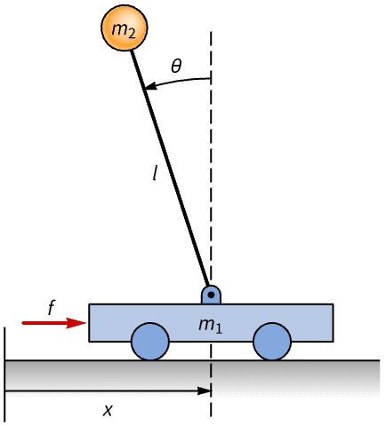 The kinetic energy of the cart and pendulum: