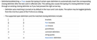 - Delimiter auto-matching is turned on by default in the Input and Code styles. The option may be toggled globally from the Interface pane of the Preferences dialog.